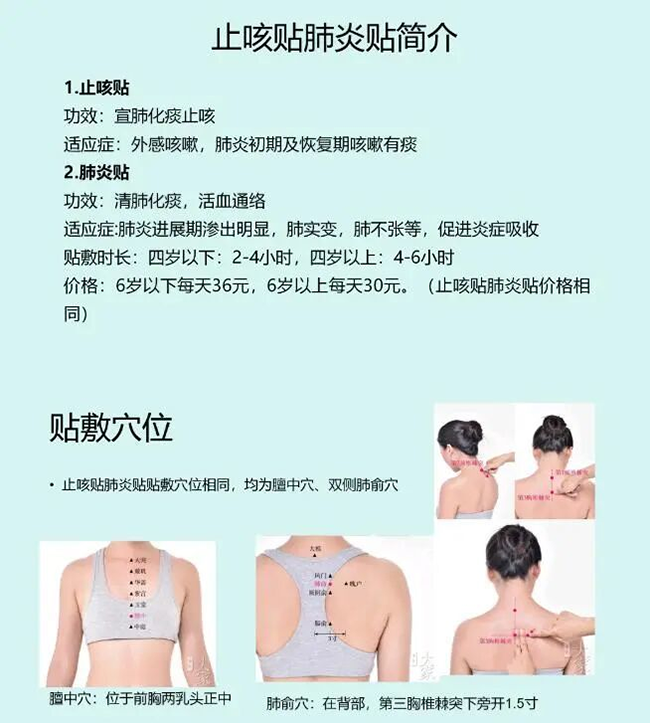 在外感咳嗽、肺炎初期及恢復期咳嗽有痰,多用止咳貼,方中含杏仁、百部、麻黃、半夏等藥物,宣肺化痰止咳,緩解咳嗽症狀。