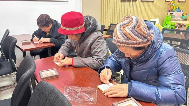 活動現場暖意融融,社工站的志願者手把手教學,從工具使用、圖案勾勒到線條鏨刻,耐心細緻地講解每一個步驟。老人們戴上老花鏡,手握特製刻筆,神情專注地在畫板上雕琢,原本普通的金箔紙,在他們手下漸漸浮現出牡丹綻放、松鶴延年等精美的浮雕圖案,立體感與藝術感兼具。