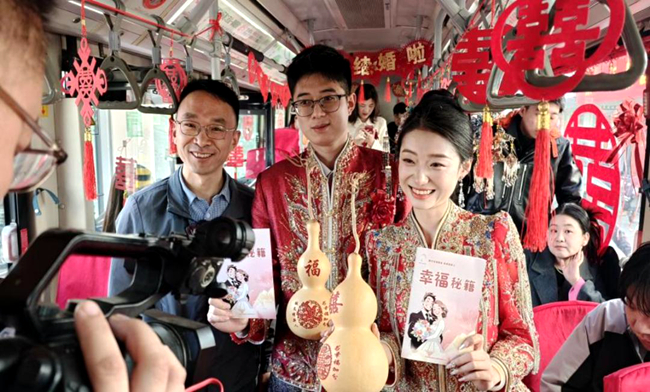 沒有長長的豪華車隊,只有一輛裝扮一新的公交車,滿載著歡聲笑語;沒有煩瑣的婚禮流程,取而代之的是手捧水果、傳遞真摯祝福的溫馨場景;沒有專業的司儀,只有新人自己主持、飽含深情的婚禮告白……
