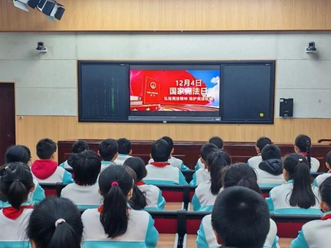 升旗儀式後,憲法晨讀環節接續進行。在領讀人的帶領下,全體師生齊聲誦讀憲法條文,朗朗的讀書聲回蕩在教室與階梯教室的每個角落。孩子們聲音洪亮,在逐字逐句的誦讀中感受憲法的莊嚴與權威;老師們神情專注,與學生們同頻共振,用實際行動傳遞對法治精神的尊崇。整個晨讀過程節奏有序,感染力強,讓師生們在沉浸式參與中加深了對憲法的認知與理解。