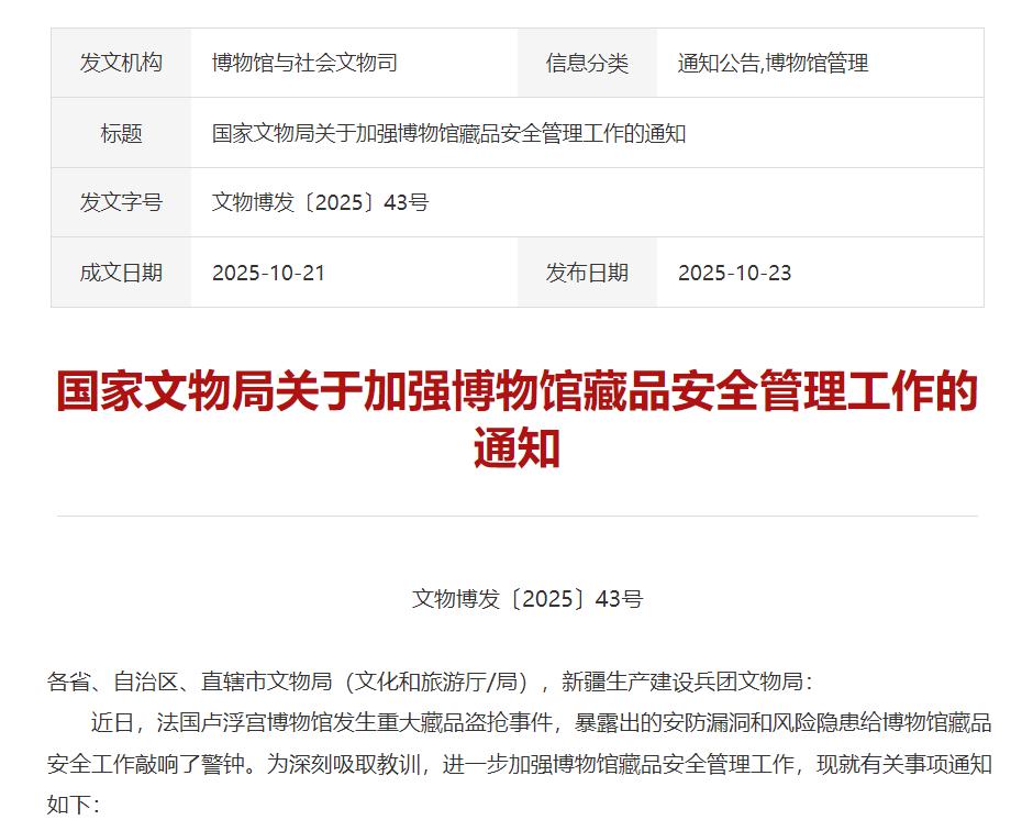 中國網10月24日訊 針對近日法國盧浮宮博物館發生重大藏品盜搶事件,10月23日,國家文物局發佈了一則關於加強博物館藏品安全管理工作的通知(以下簡稱《通知》)。《通知》強調,在觀眾流量高峰時段,各博物館要增加巡邏頻次,重點關注展櫃周邊異常行為,及時制止觀眾的不安全行為。