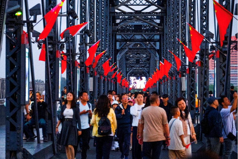 《鴨綠江斷橋上國旗飄飄》(遼寧省博物館供圖)