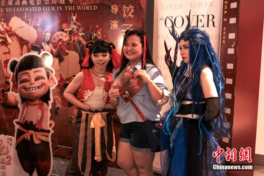 當地時間2025年3月8日,《哪吒2》在馬來西亞吉隆坡舉行首映式。圖為當地民眾扮成影片中人物,吸引觀眾合影。中新社記者陳悅攝