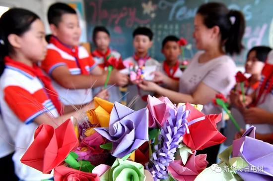 教師節到來之際,學生們把製作的手工藝品送給老師。新華社記者 王曉 攝