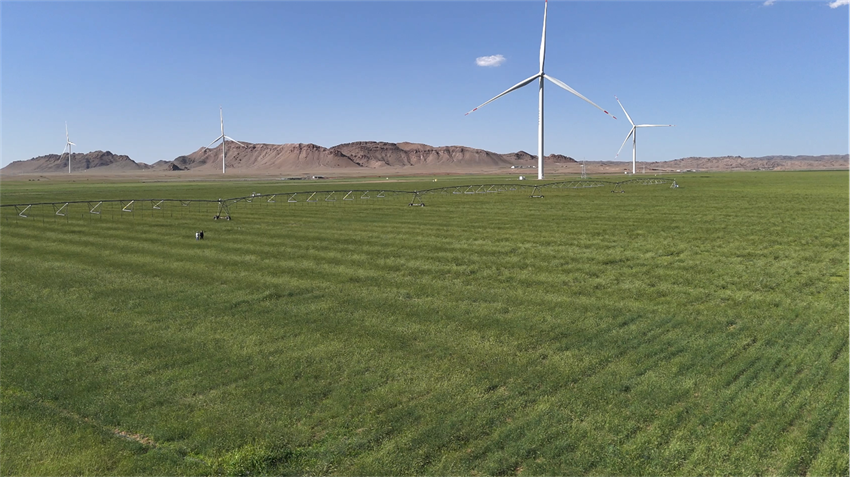 蒙草生態聯合華能、中環等新能源企業組建生態治理聯合體,立足巴彥淖爾風光資源和“沙戈荒”資源優勢,開展光伏下沙化土地生態治理與高效利用、荒漠光伏下種草技術模式整合與示範等研究應用,創新實踐“板上發電、板下修復、板間種植”的立體生態光伏治沙模式,光伏板下種植的梭梭、四翅濱藜等嫁接肉蓯蓉後,畝均效益超過1200元,有效帶動了沙漠經濟發展。
