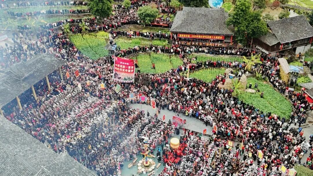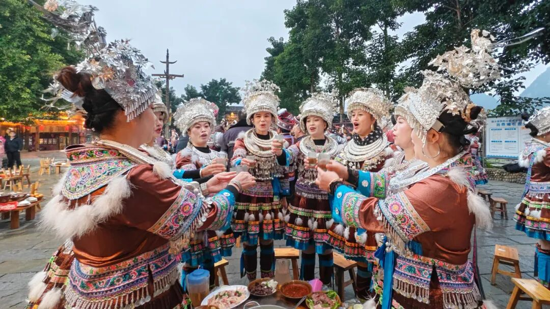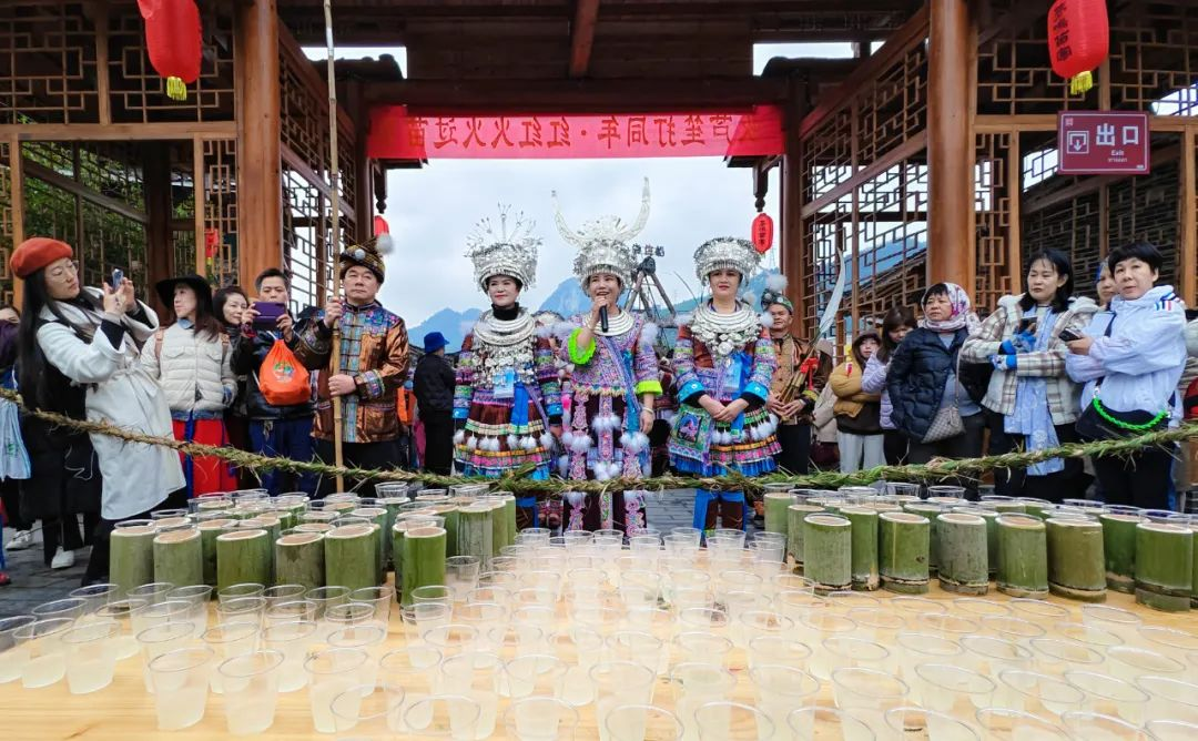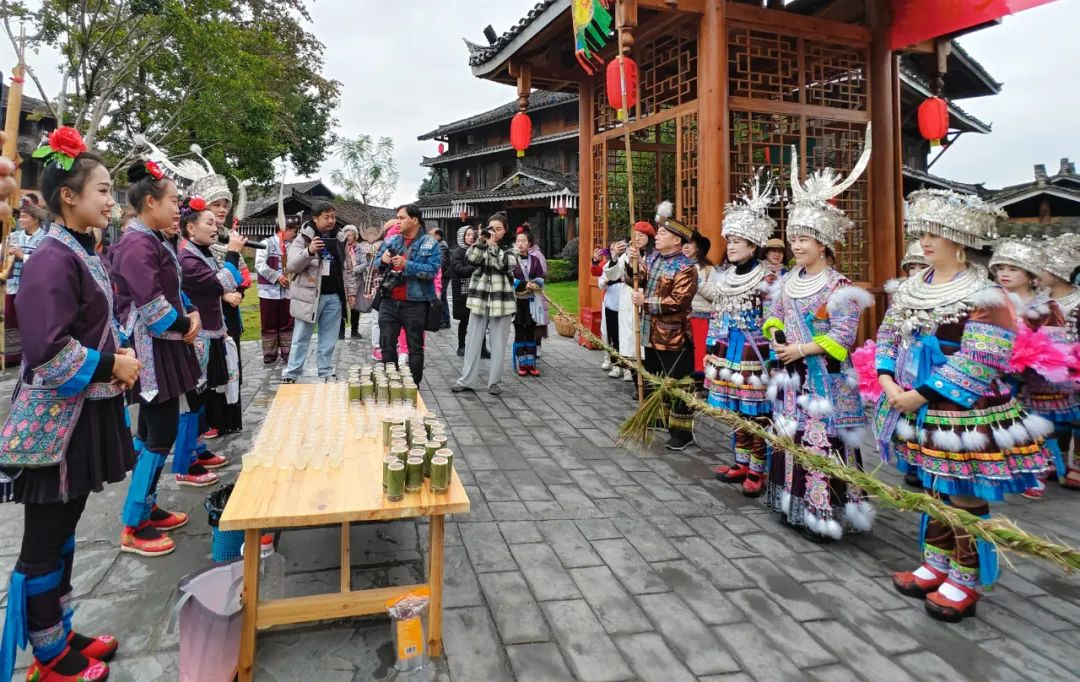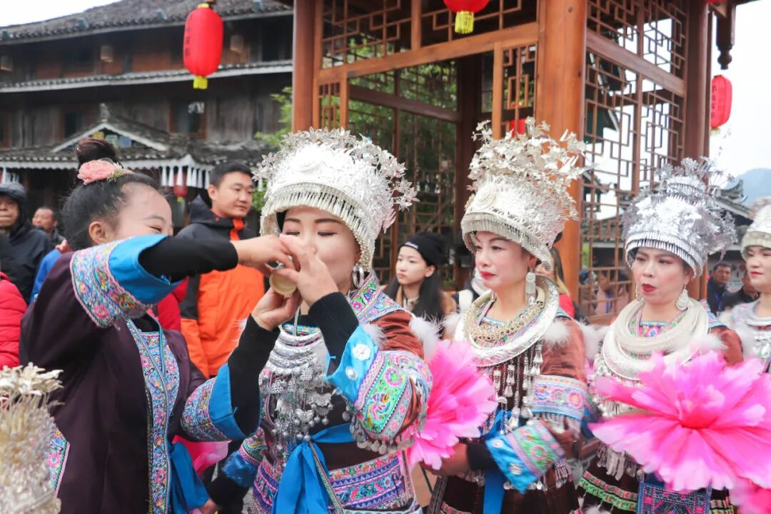 身著華麗盛裝的苗族同胞列陣寨門,醇香攔門酒敬來客,清脆銀飾聲伴著涼笙迎客曲,這是“打同年”最真摯的開場白。