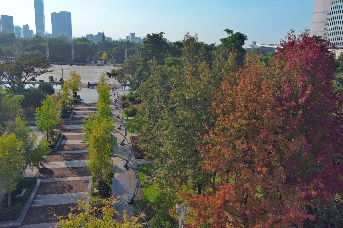 隨著氣溫逐漸轉冷,河東公園也迎來一年中色彩斑斕的季節。銀杏、楓香等色葉植物已悄然變色,將公園裝點成五彩斑斕的“調色盤”,抓人眼球。