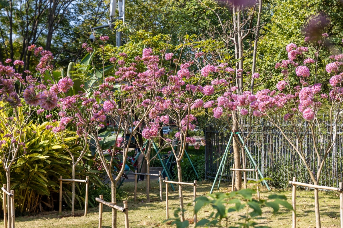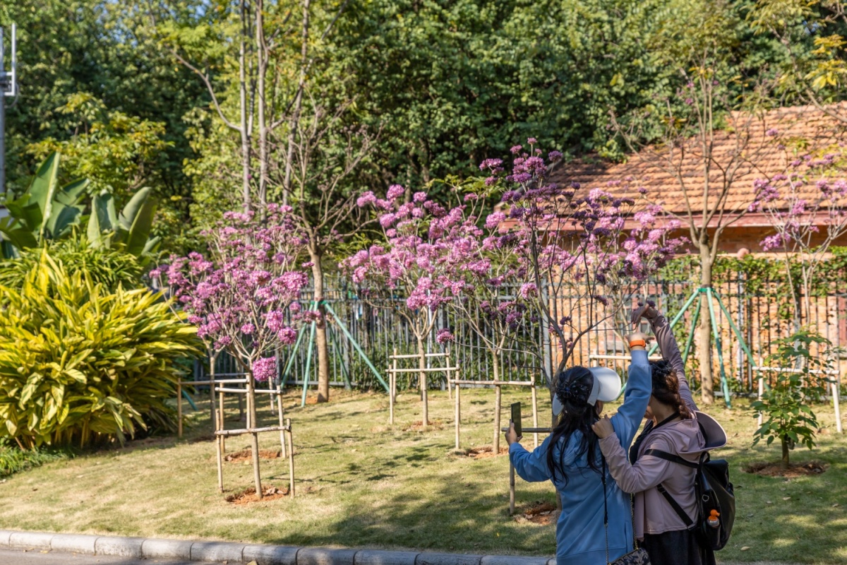 近日,柳州動物園的紫花風鈴木已鑽出一抹抹嬌嫩的粉紫色,為冬日畫卷增添一抹浪漫。遠遠望去,花朵在枝頭初綻笑顏,不見綠葉,唯有滿冠的粉紫。走近細看,簇簇花朵似風鈴似繡球,又如同小喇叭,團團相擁。