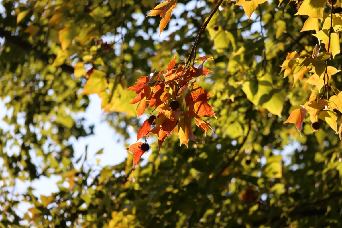 楓香則演繹著“色彩交響曲”。因周邊環境差異,葉片變色時間不一,呈現紅、橘黃、綠共存的奇妙景象。夕陽余暉潑灑樹葉,楓香的紅如火焰燃燒,橘黃的楓葉泛著蜜糖光澤,未變色的綠葉則如潑墨留白,為畫面增添層次。