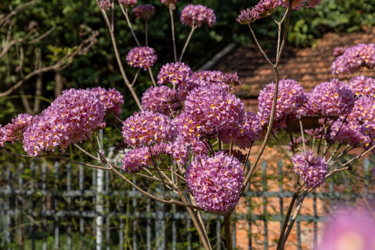 據介紹,紫花風鈴木是紫葳科風鈴木屬落葉小喬木,樹皮灰白色。花朵呈喇叭狀或漏斗狀,淺紫色到深紫色或紫紅色,常在葉腋處形成頂生的大花簇,秋冬季開始落葉,落葉同時隨即始花,幼樹開花時有少量綠葉,成年樹盛花時幾乎沒有葉片。單朵花可盛開10天左右,植株花期達30多天,花期一般在12月至翌年3月。