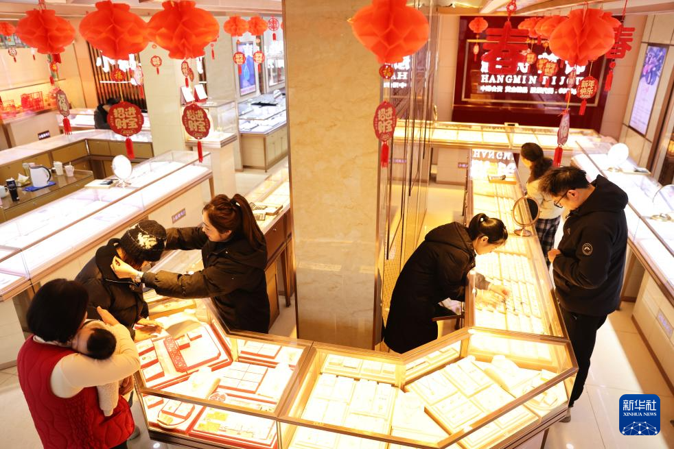 1月26日,人們在浙江湖州德清縣乾元鎮一家金店挑選首飾。