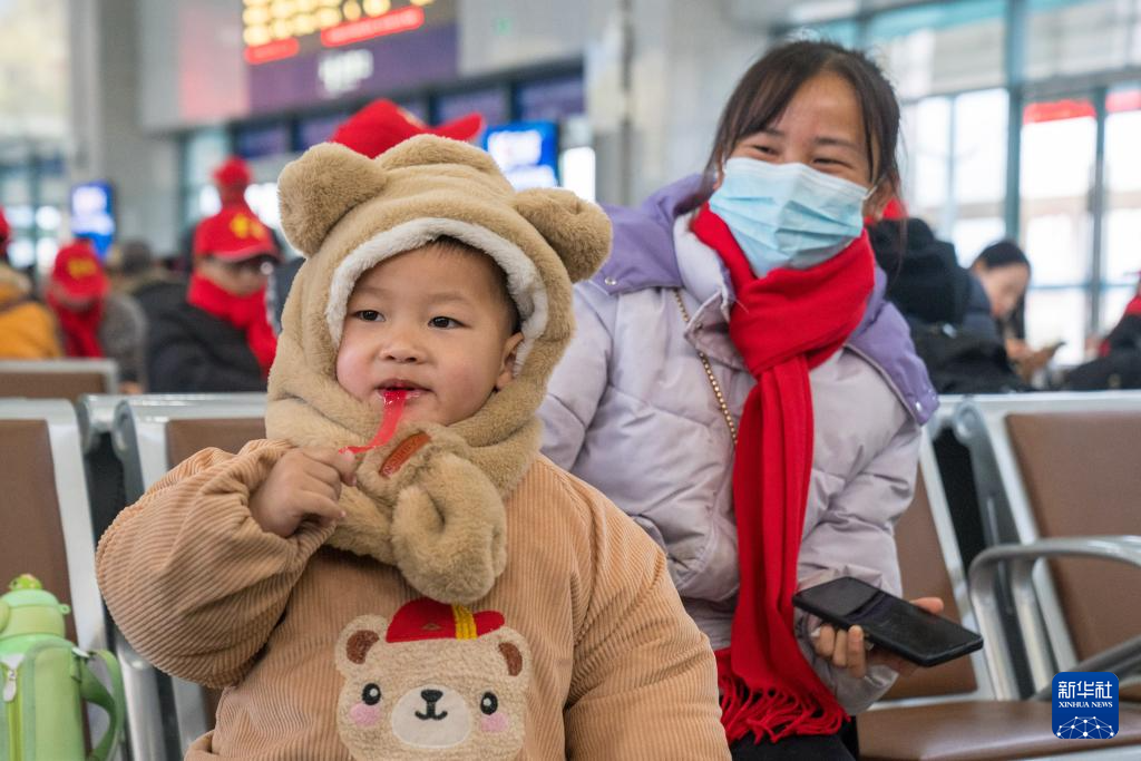 2月5日,一名務工專列的小乘客在廣南縣站候車廳吃零食。