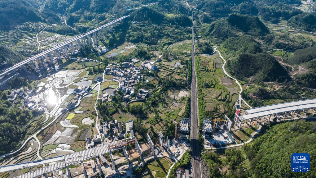 建設中的貴平高速底至特大橋(右下,跨越鐵路線)(5月12日攝,無人機照片)。