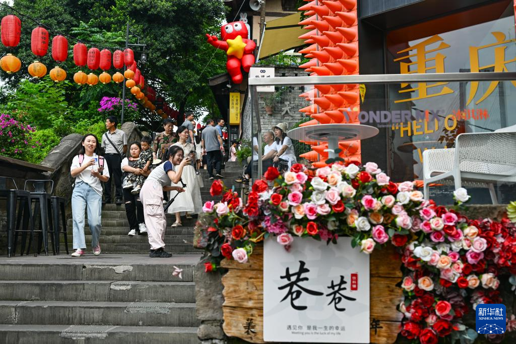 6月8日,遊客在重慶市渝中區山城巷遊覽、拍照。