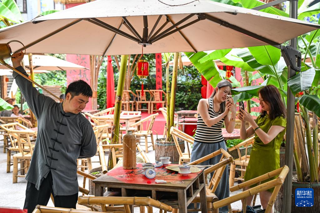 6月8日,在重慶市渝中區山城巷的一家露天茶館,茶藝表演者與遊客互動。