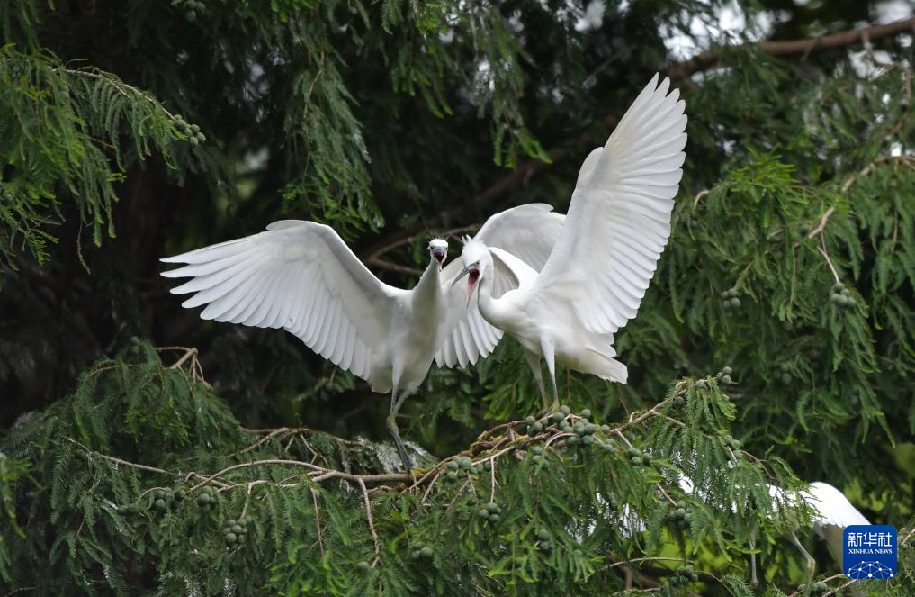 7月7日,兩隻白鷺在昆明滇池海洪濕地公園嬉戲。