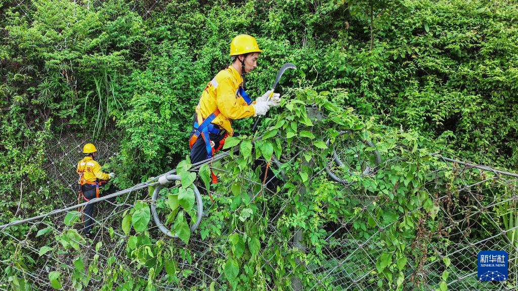 橋隧工人清除被動網上的藤蔓和雜草(7月15日攝,無人機照片)。