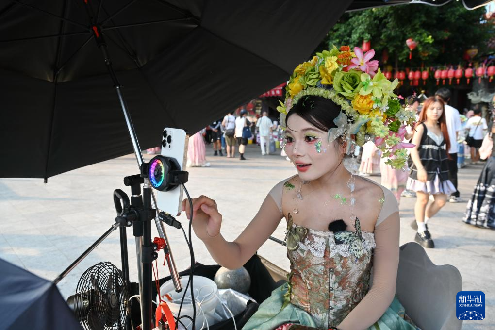 8月18日,福建泉州蟳埔村,工作人員通過手機直播為遊客介紹“簪花圍”旅拍業務。
