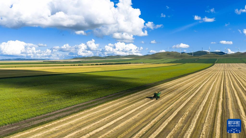 8月20日,呼倫貝爾農墾拉布大林農場的工人駕駛農機收穫小麥(無人機照片)。