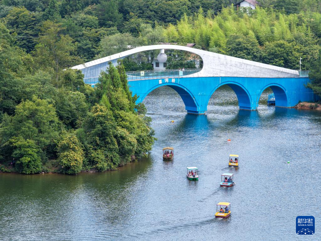8月21日,遊客在黃水鎮月亮湖景區泛舟遊玩(無人機照片)。