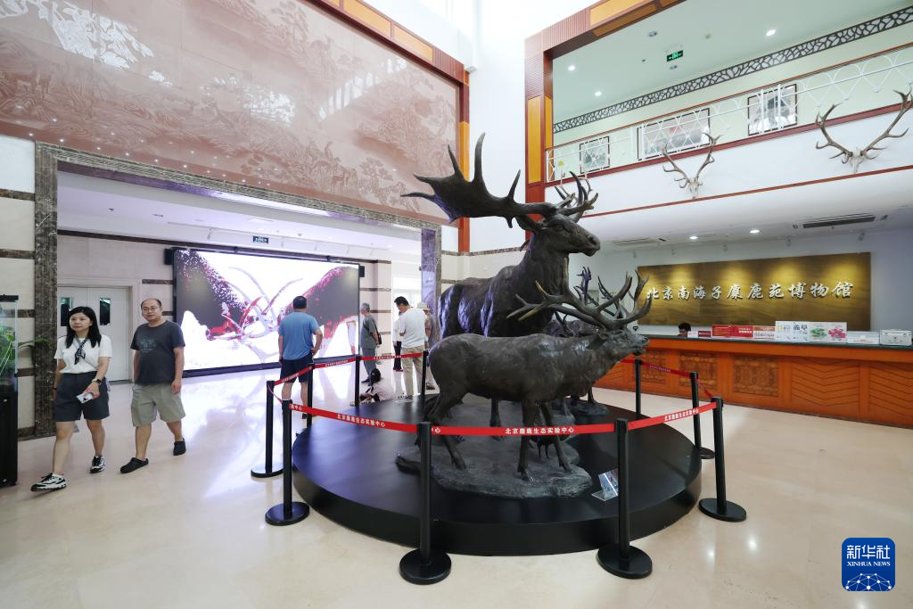 8月24日,遊客在北京南海子麋鹿苑博物館參觀了解麋鹿相關知識。