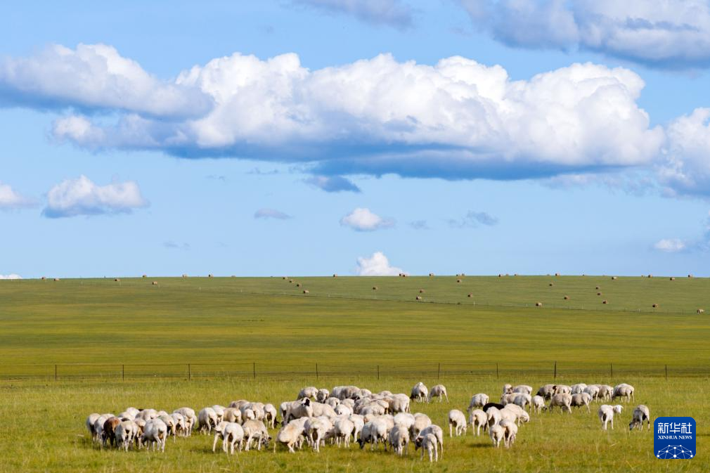 初秋時節,內蒙古呼倫貝爾大草原草色漸黃。在遼闊的草原上,牧民將豐收的牧草捆紮成卷,成群的牛羊、馬匹漫步其間,勾勒出一幅祥和美麗的秋日豐收圖景。