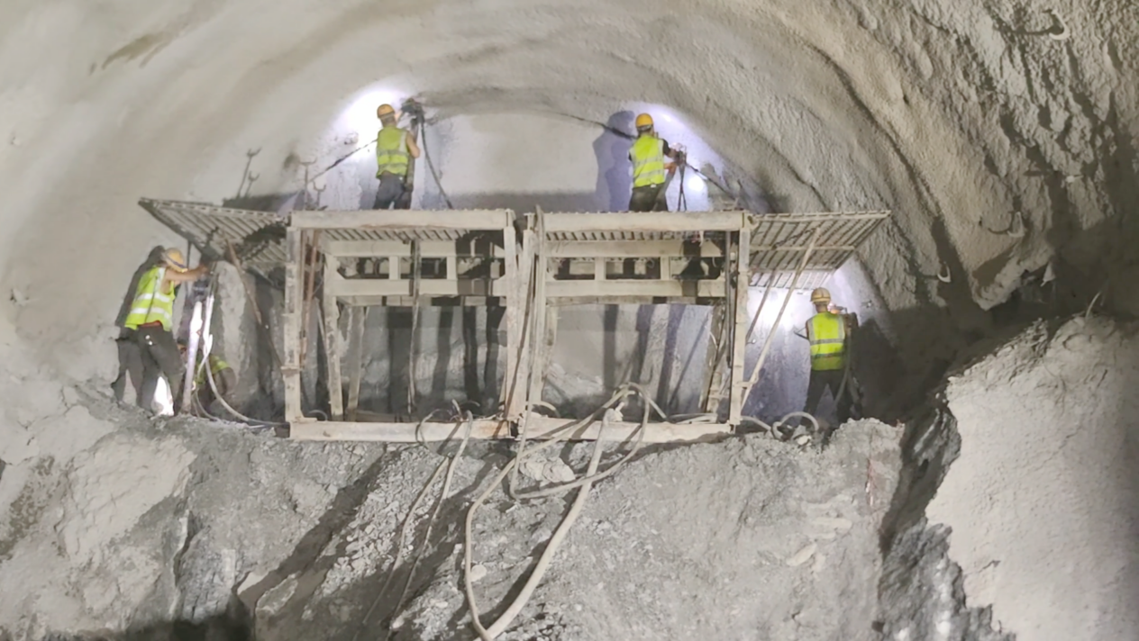 當天零點,隨著開工的鞭炮聲響起,工人們開始了新一年的工作。施工現場,全自動的濕噴機械手,正在噴射混凝土,工人們在一旁觀察著施工進度。