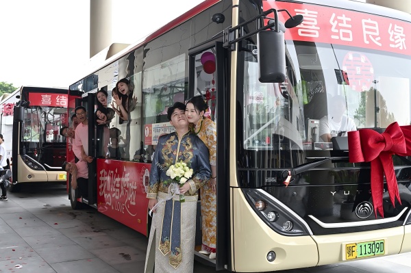 6月21日上午9時19分,兩輛貼著紅“囍”字,挂著彩色氣球的新能源公交車在湖北省棗陽市區緩緩而行。車內,新郎胡先生和新娘李女士與親朋好友有説有笑,幸福與歡樂緊緊包裹著他們。這兩輛“公交婚車”吸引了眾多路人駐足圍觀,大家目送車輛行進,紛紛送上真誠的祝福。
