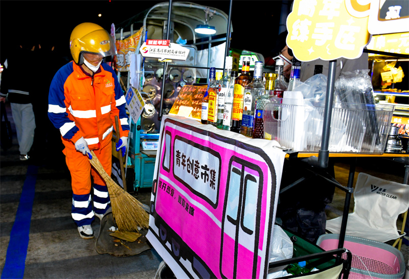 在環境衛生保障上,環衛部門創新“分散收集+集中清運+專項清理”模式:安排2名保潔員夜間巡迴保潔,3名保潔員清晨集中清掃,設置15個分散垃圾桶和2個集中收集點,每日7時前完成全部垃圾清運;每週還會開展3次高壓沖洗,清除地面油污,確保夜市地面清潔度達標率始終保持在98%以上。