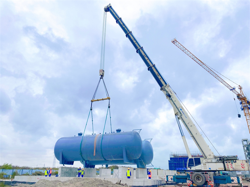液氨罐組裝置共6台儲罐,本次吊裝的2台液氨儲罐直徑4.2米,長度15.278米,單臺凈重57.975噸。正式吊裝前,項目團隊先進行了設備方位轉正。現場指揮人員精準調度,採用350噸起重機與85噸履帶起重機,將臥罐平穩轉正方位,為順利吊裝做好充足準備。吊裝過程中,全體施工人員密切配合,嚴控吊裝作業範圍,積極克服施工場地狹小等困難,用時4小時,順利完成首吊工作。
