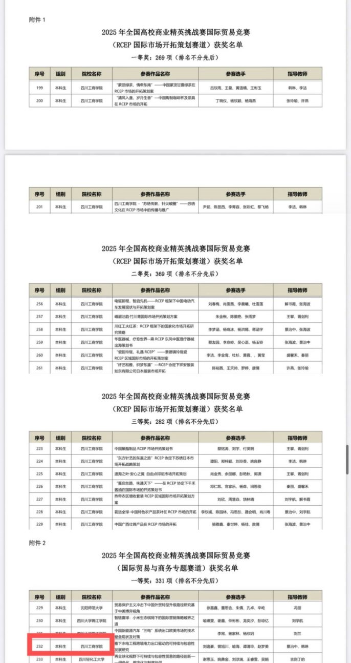 近日,全國高校商業精英挑戰賽國際貿易競賽國賽結果公佈,四川工商學院學子在省賽優異成績基礎上再創佳績:RCEP國際市場開拓策劃賽道獲3項一等獎、6項二等獎、7項三等獎;國際貿易與商務專題賽道獲1項一等獎;學校因出色組織協調獲評“最佳院校組織獎”,總計斬獲18項榮譽,彰顯人才培養強勁實力。
