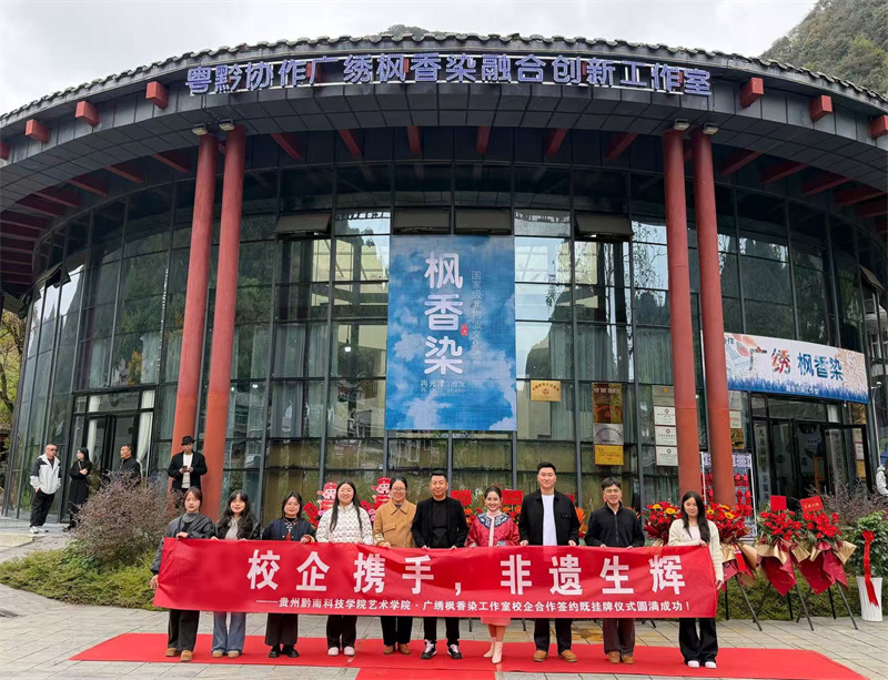 2025年10月,藝術學院與非遺傳承人、行業企業共建“粵黔協作廣繡楓香染融合創新工作室”實習實踐基地,成為傳統工藝與現代設計碰撞的試驗場。藝術學院繪畫、視覺傳達設計專業學生在這裡不僅系統學習廣繡針法與楓香染技藝,更通過“非遺+文創”“非遺+産品設計”等課程模組,探索傳統技藝的年輕化表達。