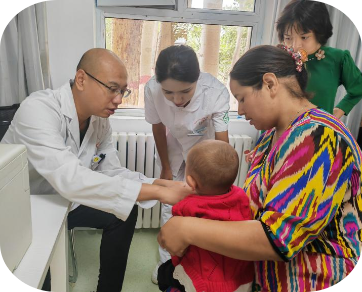在診療桌前,援疆醫生丁震宇對發育不良的小艾力(化名)進行診治,小艾力家長感激道:“我小兒子發育一直不太好,愁的不知道咋辦呢,這次丁震宇醫生來我們村義診,給我們出了治療方案,心裏懸著的石頭總算落地了,專家們坐診都坐到我們家門口來了,現在的醫療政策真是越來越好了!”丁震宇一邊記錄病情一邊對身邊的村醫講解:“這類營養不良要早發現、早干預,你們以後隨訪時重點看體重曲線和飲食結構。”他坦言:“我們來的目的不只是看幾個病人,更是要‘師帶徒’,留下一支不走的醫療隊。”