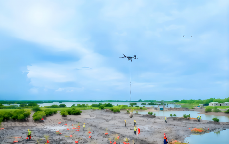 此外,在項目546公頃的廣闊修復區域中,由於遠岸區域難以涉足,傳統人工作業效率堪憂。項目團隊創新採用無人機投苗模式,精準投放甄選後的白骨壤、紅海欖、桐花樹等本地樹苗,高效打通灘塗投苗的“最後一公里”,破解了遠岸作業的核心難題。無人機與人工互相配合進行投苗、分苗、種苗,不僅有效規避了水上作業的安全風險,更極大提升了效率。最繁忙時,團隊同時投入6台無人機,每台一次可吊運40株帶泥球的種苗,一名熟練操作手日投苗量可達2000至3000株。