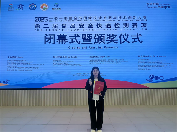 近日,2025“一帶一路”暨金磚國家技能發展與技術創新大賽“食品安全快速檢測賽項”全國總決賽在廣東科貿職業學院落下帷幕。漯河醫學高等專科學校(以下簡稱“漯河醫專”)公共衛生與健康營養學院教師陳衝憑藉紮實的專業知識和精湛的實踐操作能力,在教師賽中脫穎而出,榮獲二等獎,充分展現了學校在食品安全快速檢測領域的教學實力與人才培養品質。