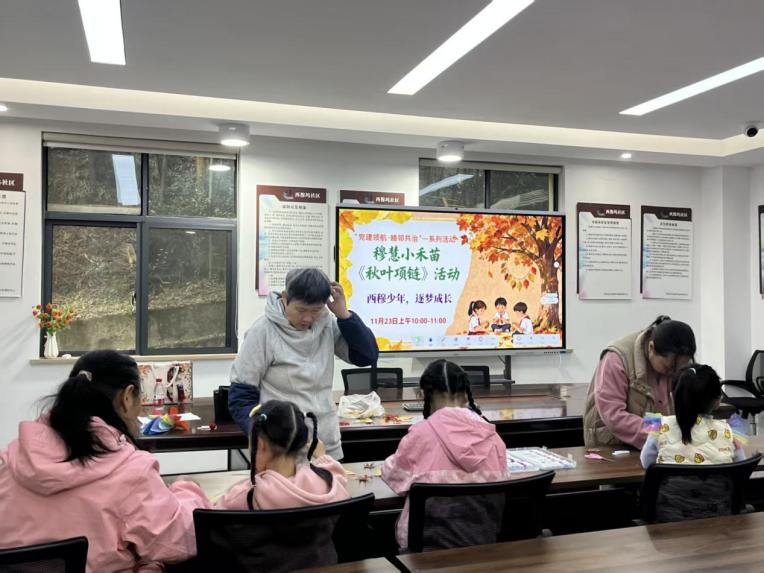 西穆塢社區文化家園裏,孩子們製作了“穆慧小禾苗·秋葉項鍊”。作為社區“西穆少年·逐夢成長”系列活動之一,這項創意手作為孩子們提供了探索興趣、收穫陪伴的成長平臺。