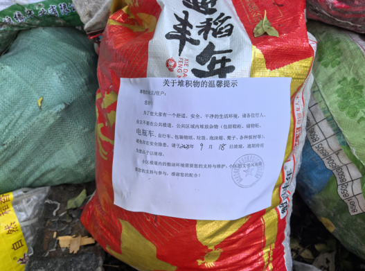 改造期間,小區公共區域易出現生活垃圾或私人物品堆放,影響垃圾分類投放秩序。此處應在整體顯眼區域張貼“小區公共區域請勿堆放私人物品”通知單,並在每個私人物品處張貼“關於堆積物的溫馨提示”,明確清理時間,督促及時處理。