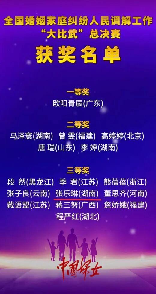 11月26日至27日,由全國婦聯、司法部主辦的全國婚姻家庭糾紛人民調解工作“大比武”總決賽在湖南省長沙市舉辦。婁底市婁星區人民法院法官張樂琳,經過層層選拔,作為湖南代表隊成員出征全國婚調“大比武”總決賽,從全國96名選手中脫穎而出,闖進前16強並榮獲三等獎。