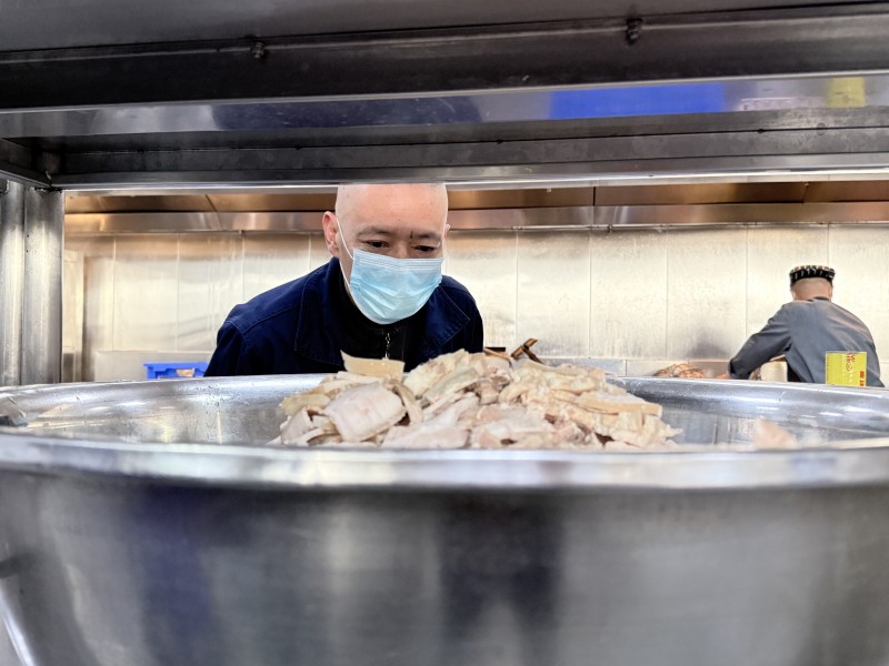 為築牢食品安全防線,他主動學習HACCP管理體系,嚴格執行六道“安全關口”。後廚裏,“一摘二清三浸泡”的標語貼在墻上,紅、藍、綠三色案板分別對應生肉、蔬菜、熟食,125℃熱力消毒後的食具透著幹爽。“高風險食材批批檢,每餐留樣125克,雙人雙鎖存夠48小時。”他始終一絲不茍、嚴格無誤地執行著這些要求。