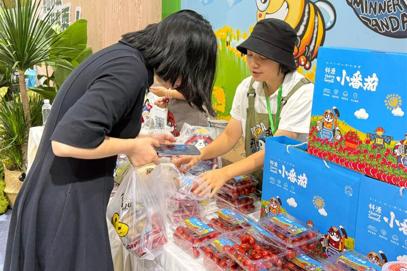 “您嘗嘗我們的斜源爆汁小番茄,口感特別清甜!”參展企業“西行驛站”的品鑒臺前,試吃後的市民客商紛紛點讚,不少人當場下單。來自四川綿陽的張女士手持剛購買的番茄禮盒説:“這小番茄糖分足、汁水多,是我吃過的優質産品之一,買幾盒帶回去給家人和朋友都嘗一嘗。”