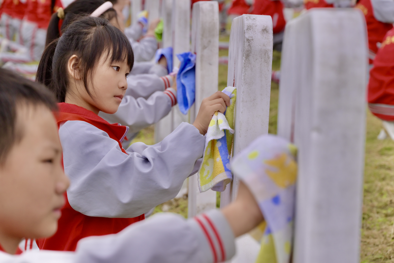 他們俯下身,用清水仔細洗去墓碑上的塵埃,動作輕緩而專注。遇到刻痕較深的五角星,學生何子萱便會用指尖頂著毛巾的一角,小心翼翼地勾畫著星芒的輪廓,仿佛要將它打磨得更加明亮。學生林君昊小心翼翼地用白毛巾擦拭著一塊無名烈士墓碑的頂端,輕聲説:“冰涼的石頭好像被手心捂熱了。老師説,他們犧牲時很多都和我們的哥哥姐姐一般大,他們沒有名字,但我們不能讓他們被忘記。”一旁的高年級學生雷陳程發現碑體有一道細微的裂痕,便用手指細心地將縫隙中的泥土剔除,“每擦亮一顆紅星,就好像看到他們在對我們微笑。我們今天的安寧,就是他們當年最大的願望。”