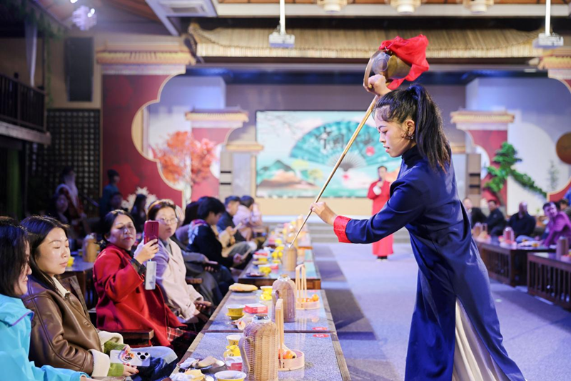 彭鎮老街的蜀戲臺茶館則為嘉賓們帶來了一場地道的川味民俗盛宴。臺上,川劇變臉藝人功底深厚,一轉身、一甩袖間,五彩臉譜瞬間變換,利落的技法與精妙的演繹引得台下掌聲與驚嘆聲此起彼伏,讓中外嘉賓充分領略到川劇藝術的神奇魅力。一旁的茶藝表演同樣吸睛無數,茶藝師手持長嘴銅壺,動作行雲流水,“鳳凰三點頭”等經典技法信手拈來,滾燙的茶湯在壺嘴與茶杯間劃出優美弧線,精準注入杯中。茶香嫋嫋升騰,不僅散發著川茶文化的雅致韻味,更傳遞著雙流的生活美學,不少嘉賓被這份傳統魅力深深打動,主動上前與茶藝師交流學習。
