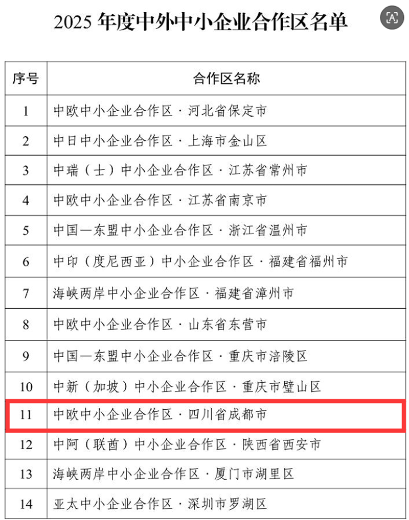 近日,工業和資訊化部公佈2025年度中外中小企業合作區名單,成都市“中歐中小企業合作區”成功入選,成為全國首批14個合作區之一,也是四川省唯一的國家級中外中小企業合作區。這一“國字號”招牌正式落子青白江,標誌著成都國際鐵路港經濟技術開發區躋身國家級對外開放新平臺。這裡不僅是成都發展外向型經濟的重要承載地,更是成都對歐連結合作的關鍵“節點”。