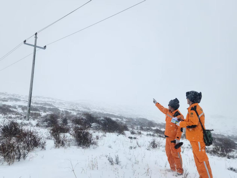 國網阿壩若爾蓋縣供電公司唐克供電服務站員工在轄區內對10千伏線路開展雪天線路特巡工作。(格讓措/攝)