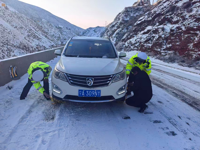 同時在國省道重點路段加強積雪、路面結冰以及急彎陡坡等易發生交通事故路段的清理和巡邏頻次,充分利用鳴警笛、閃警燈、喇叭喊話等方式,對過往車輛駕駛人進行不間斷的安全喊話提示,提醒過往車輛駕駛人降低車速,保持安全車距,駕乘人員係好安全帶。對被困打滑車輛,執勤民輔警化身“推車俠”,冒著寒風,用肩膀和雙手助推被困車輛,為群眾開闢出一條條“溫暖之路”。