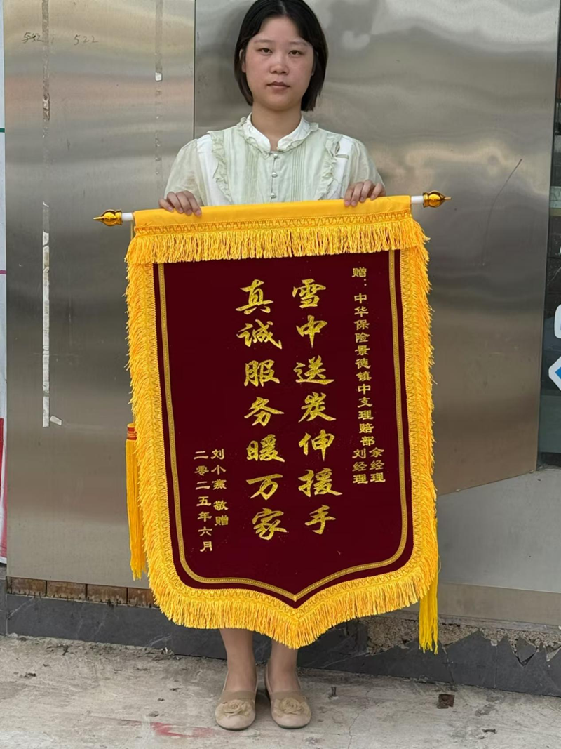 近日,樂平市發生一起意外死亡案件,令人痛心不已。在這一特殊而沉重的時刻,中華財險景德鎮中支以積極主動的服務態度、高效的理賠速度,溫暖了逝者家屬的心,贏得了高度讚譽與由衷感謝。家屬特地製作錦旗,送到公司,以表達深切謝意。