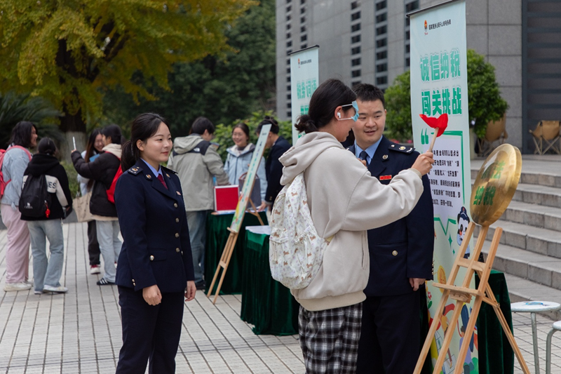 “同學,你抽到了字母‘K’,請組一個首字母為K的稅務詞語”“扣稅!”。室外活動區氣氛熱烈,展陳佈置的農民畫、剪紙等非遺文化作品以及四川稅務新媒體矩陣前人頭攢動,“套圈‘判官’”“稅務詞語拼拼樂”“誠信納稅闖關挑戰”等互動小遊戲將稅收知識融入趣味體驗中,吸引學生踴躍參與。在輕鬆愉快的互動中,稅收政策以鮮活的形式深入人心。