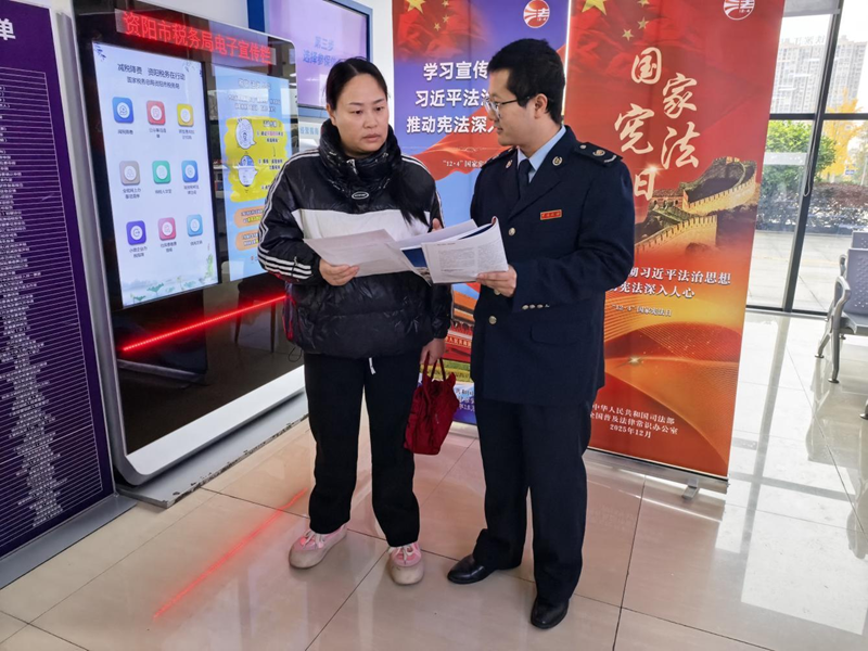 雁江區稅務局充分發揮辦稅服務廳前沿陣地作用,組織公職律師走進辦稅服務廳,結合涉稅諮詢,面對面為納稅人繳費人講解憲法原則、公民權利義務、涉稅法律法規等知識。充分發揮導稅員一線服務優勢,在引導辦稅、解答疑問的同時,開展精準化、伴隨式憲法宣傳,使法治宣傳融入日常服務,讓普法更接地氣、更具溫度。