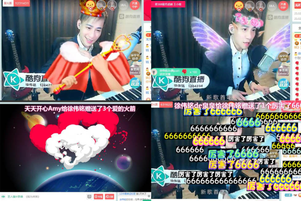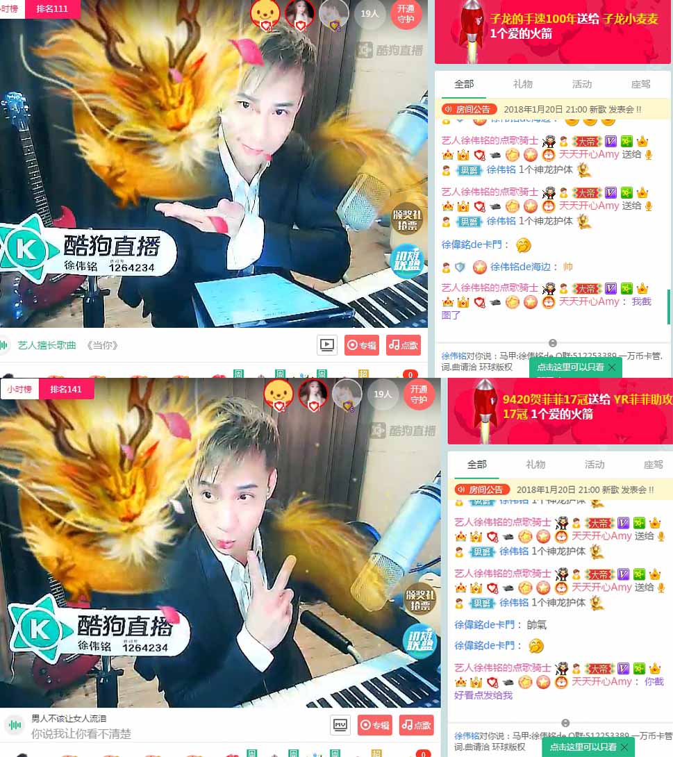 唱歌之餘看到有粉絲送出禮物“神龍護體”,徐偉銘就擺出各種表情姿勢讓粉絲們截圖,帥氣又可愛。在直播快結束時粉絲們也不忘了讓他多寫歌,不要浪費這優質好聲音和才華。