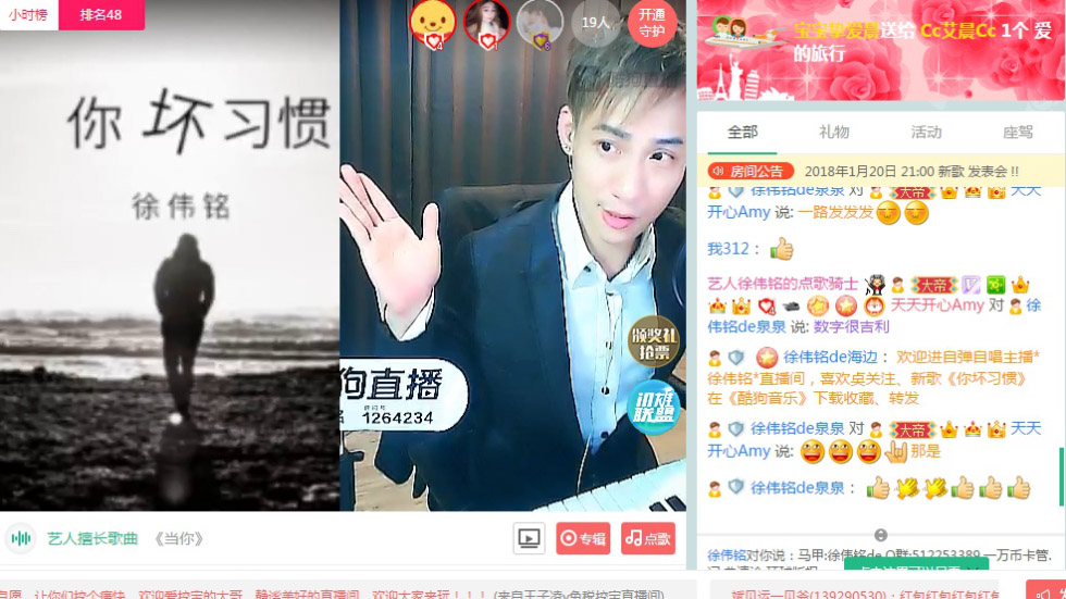 有一位在樂壇不顯山露水的創作人,張信哲的《説謊》、鬱可唯的《好朋友只是朋友》、胡歌的《好好過》等歌曲都出自他之手,他就是知名詞曲創作人徐偉銘,為一眾藝人大咖寫歌作詞後,他也為自己創作了一首歌曲《你壞習慣》,並於1月20日晚在酷狗直播帶來他的新歌首唱會。